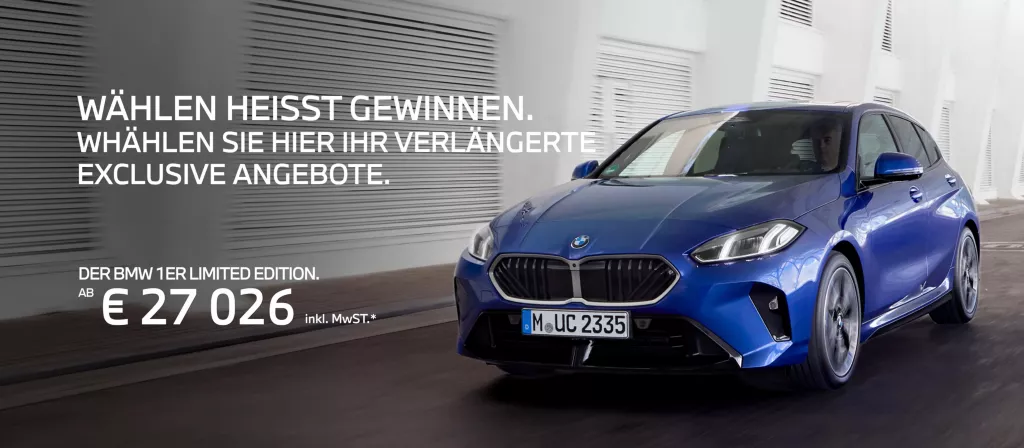 Die BMW 1er Limited Edition gibt es bereits ab 27.026 € inkl. MwSt. Mit den verlängerte exklusive Angebote. ist jetzt der ideale Moment, sich für BMW zu entscheiden. Besuchen Sie Ihren BMW Händler in Ihrer Nähe.